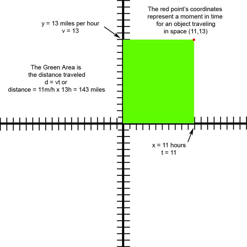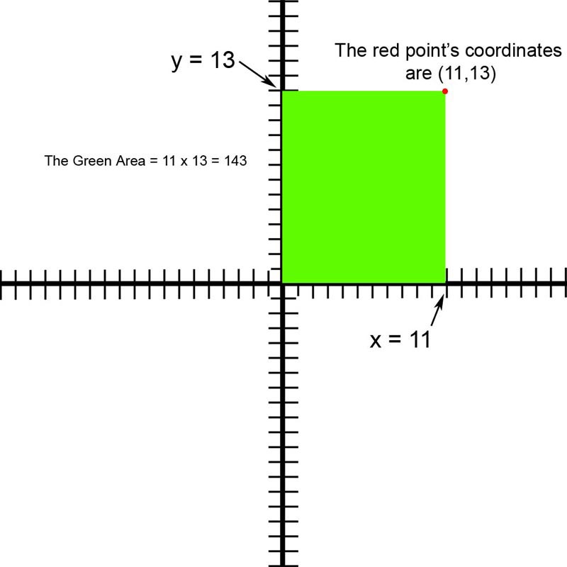 The area of a rectangle is product of the lengths of its sides and in the upcoming example the product of the values for the x and y coordinates of this point. Of course this one is a special case because we used the axis origin as our starting point. Example: Let us arbitrarily pick a point defined by the x-y coordinates of (11,13) and draw lines perpendicular to the axes to illuminate what I just said. The area of any rectangle is equal to its height multiplied by its base (The product of the lengths of its sides). We have a green rectangle delineated on our axis system. (See figure. 1) The height of our rectangle is 13 units and it base it 11 units. The area of our rectangle is 143 square units or 13 X 11 = 143
