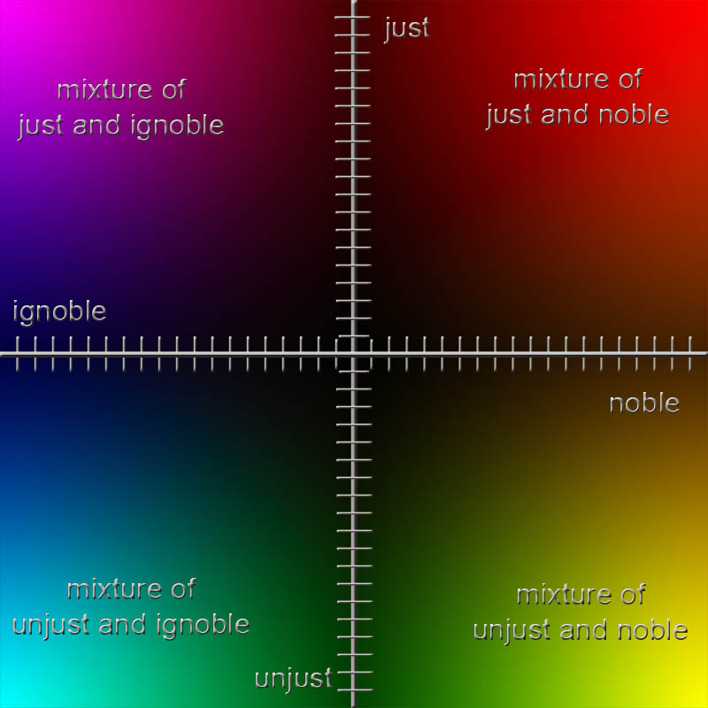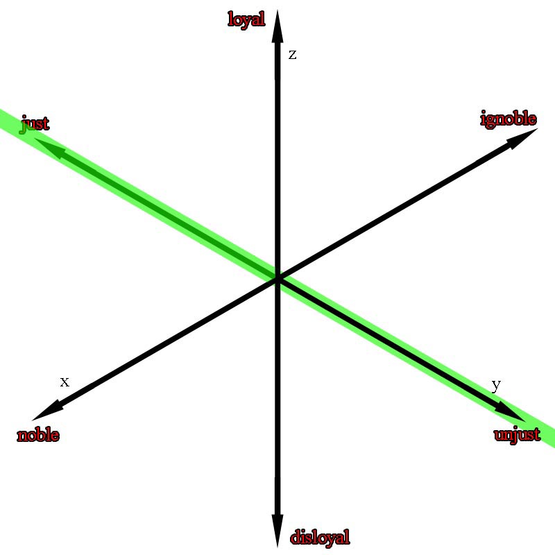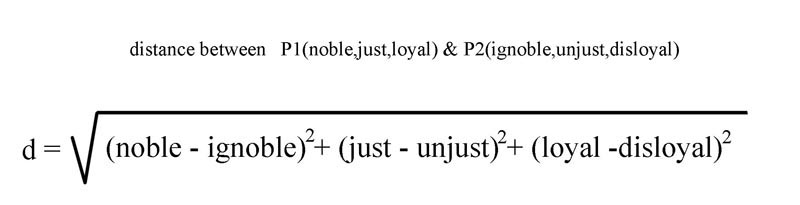 Now lets look at the expression for the distance between the points P1(noble,just,loyal) and P2(ignoble,unjust,disloyal) see figure 34