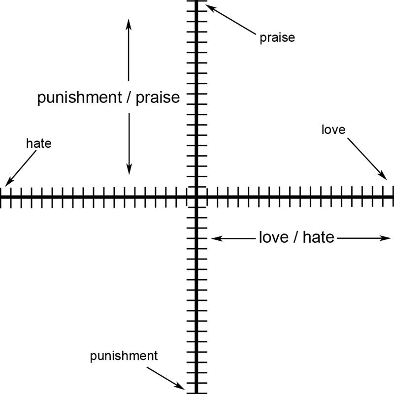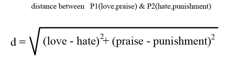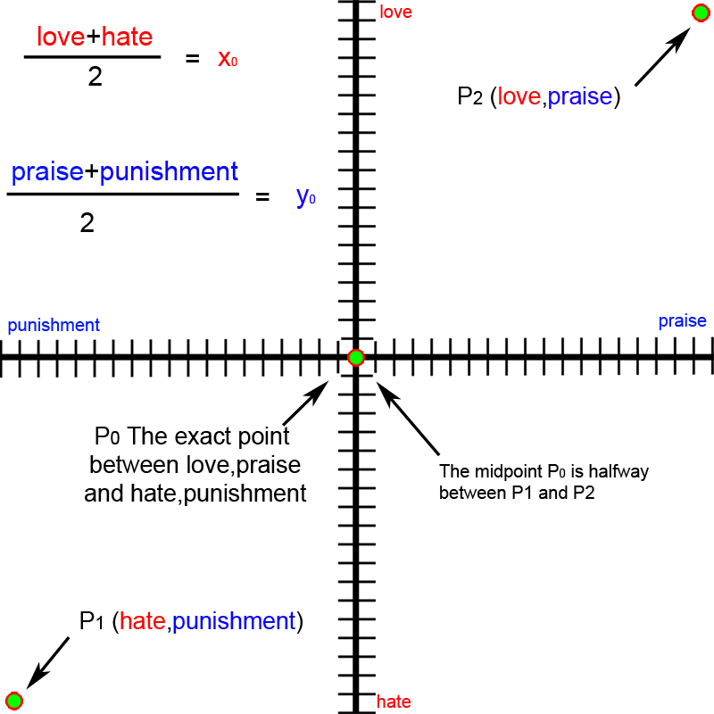 Let us now take a different approach and replace the numeric variables in the midpoint equation with the words/concepts of love, hate, praise and punishment. We will use the form of coordinate word-pairs P2(love, praise) and P1(hate, punishment). The midpoint formula now shows us that P0(x0, y0) will be formed by the substitution of (x1 + x2)/2 = x0 with (love + hate) = x0 and (y1 + y2)/2 = y0 with (hate + punishment) = y0. Now we have expressed the exact point between love, praise and hate, punishment. (see figure 15.)