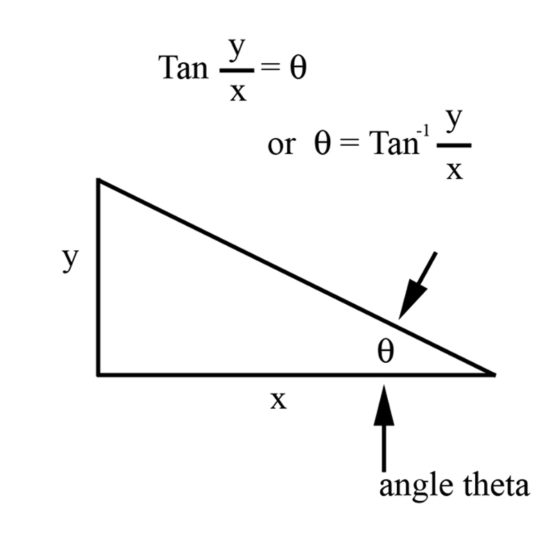 2.4. Verbogeometry with Trigonometry: First let us solve a pertinent traditional trigonometric problem, which requires a solution for an angle. Let us make 'theta' the variable of the angle in question. The tangent of a right triangle is defined as the ratio of the side opposite the angle 'theta' to the side adjacent to the angle 'theta'. If we call the side opposite distance "y" and the side adjacent as distance "x" we then arrive at tan (angle theta) = y/x (See figure 16)
