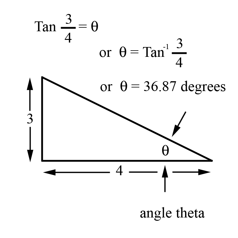 It also follows that if we know the distance of two sides of a right triangle we can find all the angles. Let us look at an example with the side opposite angle theta being 3 and the side adjacent to angle theta being 4 and. Let us now solve for the angle theta. We know that y/x = tan (theta) so it follows ¾ = tan (theta). To uncover the value of theta, we must take the inverse tangent of ¾. Symbolically this is stated as "theta = inverse tan(y/x)" or approximately 36.87 degrees (See figure 17).