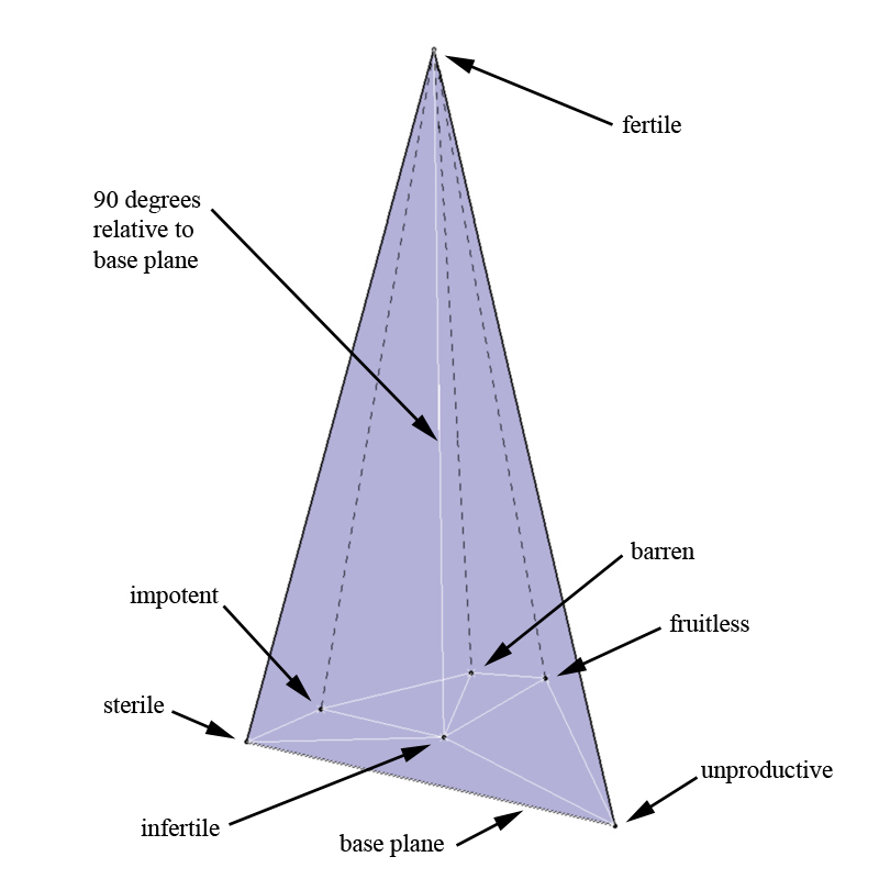 2.5. Prismatic Structures in Verbogeometry: Notice that 'barren and fertile' is a complex antonym and 'fertile and infertile' is a simple antonym as previously defined. This is interesting because we can see that there exists in verbogeometry a geometric construction where a line expressed as a simple antonym is normal (90 degrees) to a plane containing all of the complex antonyms related to the line which is expressing the simple antonym. To illustrate this idea lets look again at the relationship between the simple antonyms 'fertile' and 'infertile' and the synonyms 'barren', 'fruitless', 'unproductive', 'sterile', 'impotent' which reside on the plane that is normal (90 degrees) to the line created by the simple antonyms. Furthermore you can draw lines from all of the synonyms back to the complex antonym 'fertile'. (See figure 19)