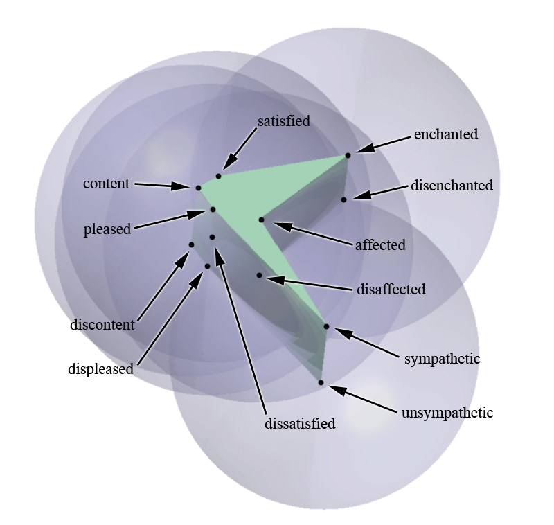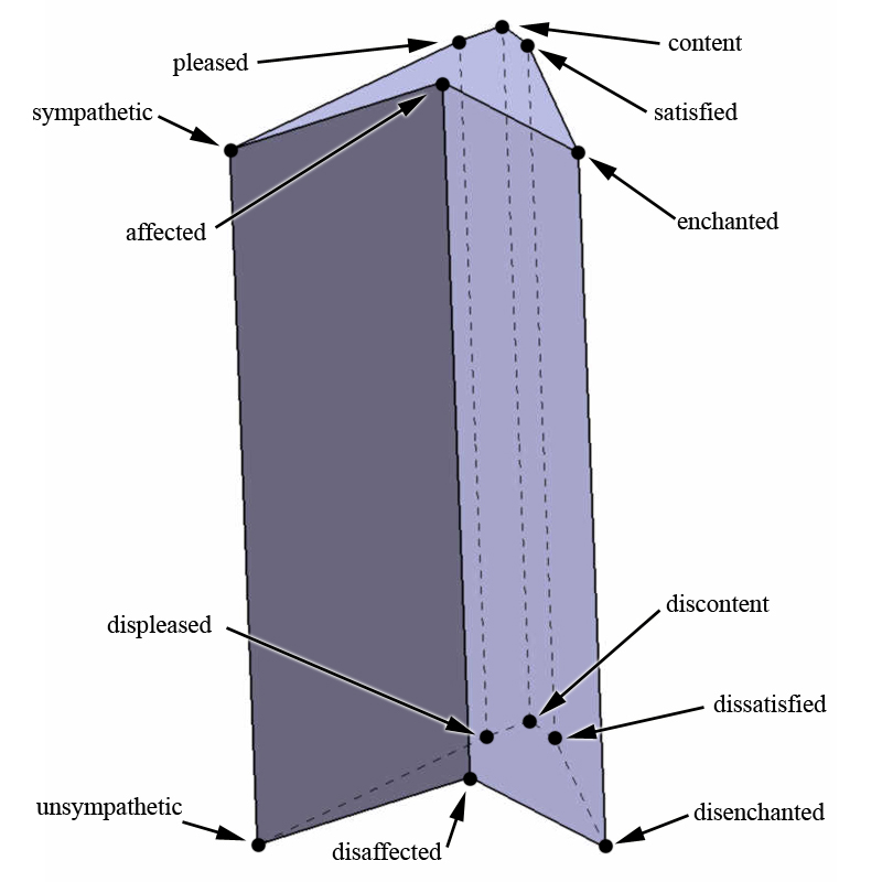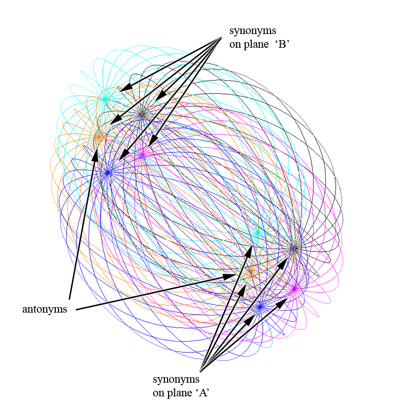 This idea also lends itself to prismatic structures where we have a group of parallel simple antonyms whose endpoints construct polygonal faces on two parallel synonym-planes. (See figure 19) Example: Let us define one synonym plane containing the words 'pleased', 'content', 'affected', 'satisfied', 'enchanted' and 'sympathetic'. The other plane contains the following simple antonyms for the previous group of synonyms: 'displeased', 'discontent', 'disaffected', 'dissatisfied', 'disenchanted' and 'unsympathetic'. Due to the synonyms of one plane have corresponding simple antonyms which create lines 90 degrees from the synonym-plane then the simple antonyms are synonyms of each other and reside on their own individual synonym plane and because the lines are 90 degrees to each other the planes must be parallel. The former verbiage is a lot easier to understand visually (See figure 20)