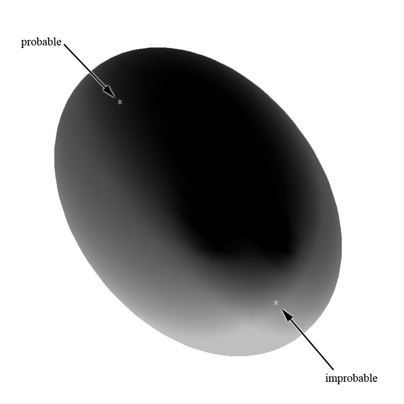 On a side note: Everything that we have been talking about up to this point has been viewed in Euclidian space. Not much time has been spent exploring verbogeometry outside of Euclidian space. However, I see that there can be a lot more thought evolving models of verbogeometry in other spaces. For example, Instead of viewing antonyms and all the varying meanings spread out across a number-line, we may think of the antonyms as magnetic dipoles. Furthermore, all the varying meaning between them is analogous to a magnetic flux. Yet again, another view may be looking at the antonyms residing at the endpoints of a major axis of a three dimensional ellipsoid and the varying meanings reside on the surface of the ellipsoid. (See figure 21)
