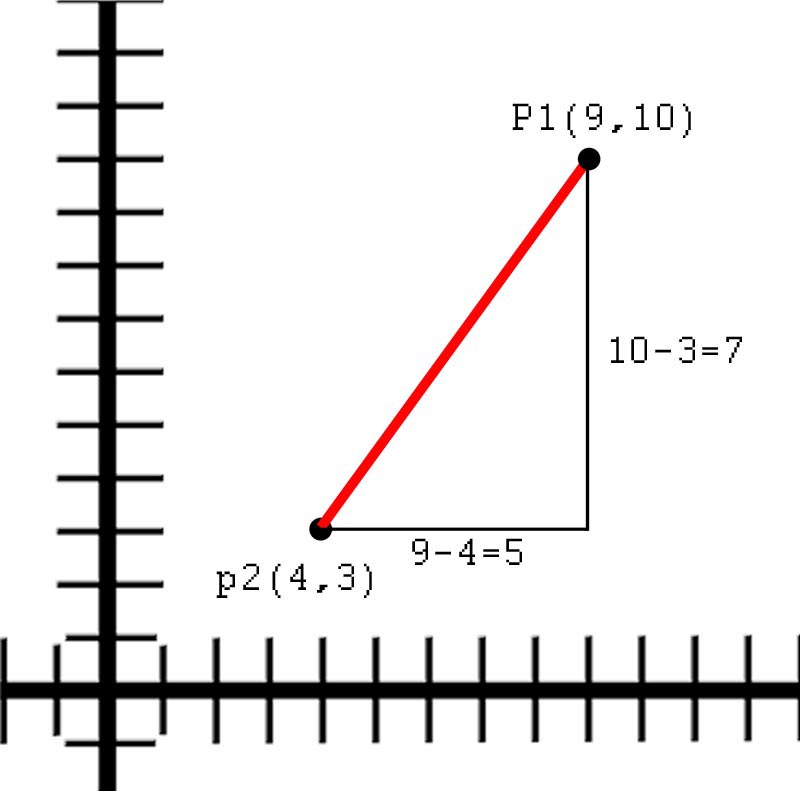Let us plot two points on a two-dimensional axis system P1(-9,10) and P2(4,3) and If we draw a lines between the points and lines parallel to the axes we can obtain a right triangle. (see figure 28)