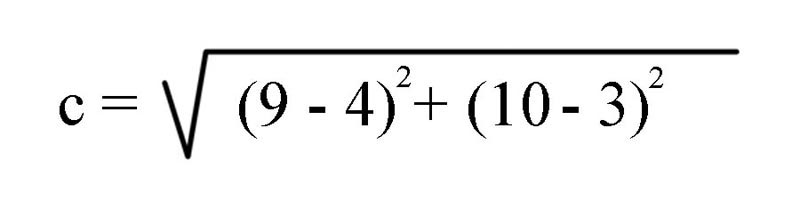 To solve the length of the hypotenuse we first find the difference between the x values and the y values to create the sides of the triangle then we plug the values into the Pythagorean Theorem. x value is 9 - 4 = 5 and the y value is 10 - 3 = 7 Now we plug it to the equation and we get the expression in figure 29