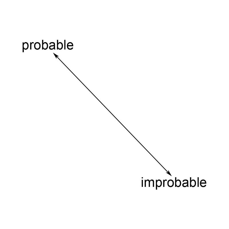 Life is full of dualities it is hard to think about qualities without thinking about opposing ideas. We can view our 'probable / improbable' one-dimensional line as a number line but instead of values of numbers on the line, we think in terms about having different levels of meaning between the two words residing at each end of the line. Due to a number-line being a one dimensional axis it is easy to visualize a word-axis as an axis for a single spatial dimension. We call any pair of words connected by a line a word-axis. Two perpendicular number lines or word axes make a two-dimensional word-axis as well as defining a word-plane. We also have the ability to view the word-plane as an infinite number of coordinates delineated by the word-pairs much like the infinite number of coordinate pairs contained within a Cartesian coordinate system described in the realm of analytic geometry.