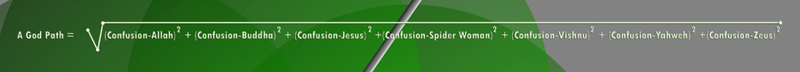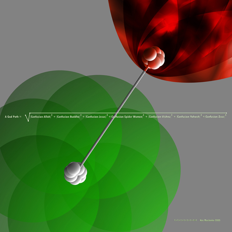 Figure 35 shows the mathematical poem 1+1+1+1+1+1+1+1 =1 This is a metaphorical piece that creates a metaphoric path from the concept of confusion, to where seven deities meet. The piece uses the analytic geometry distance formula in a seven dimensional space where each dimension is a gradation from confusion to a point where a deity exists.