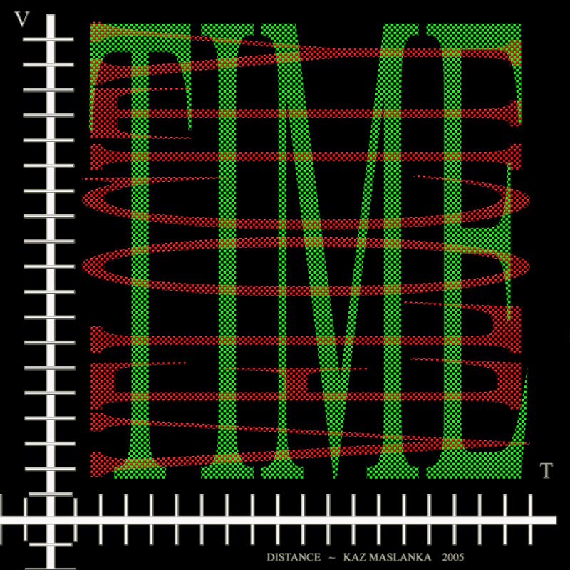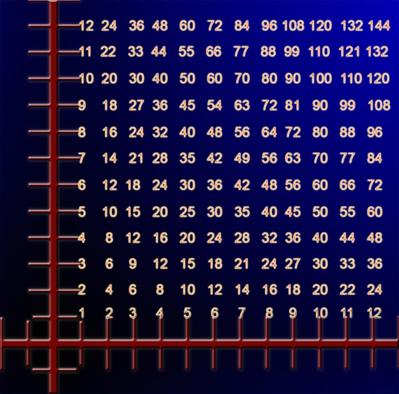 Figure 4 shows a visualization for the physics equation; distance = velocity multiplied by the time. Notice that the y axis displays velocity and the x axis displays time. When we multiply and blend the words in an infinitesimal weave, we arrive at the concept of distance in a tessellated product of the concepts of velocity and time. In another words by positioning the two axes perpendicular to each other, we view every value on one word-axis in relation to every value on the other word-axis. This method affords us a way to 'feel' the entire word plane or axis system with all its different augmented values and gradations. When we multiply two word-axes together we conceptually tessellate a two dimensional plane with different semantic values of the two words blended and augmented. If we were to take a normal Cartesian coordinate system and multiply the x positive integers (1 through 12) times the y positive integers (1 through 12) we get a tessellated plane as in Figure 5 (see figure. 5) (notice the intensity of blue relative to the value of the numbers)