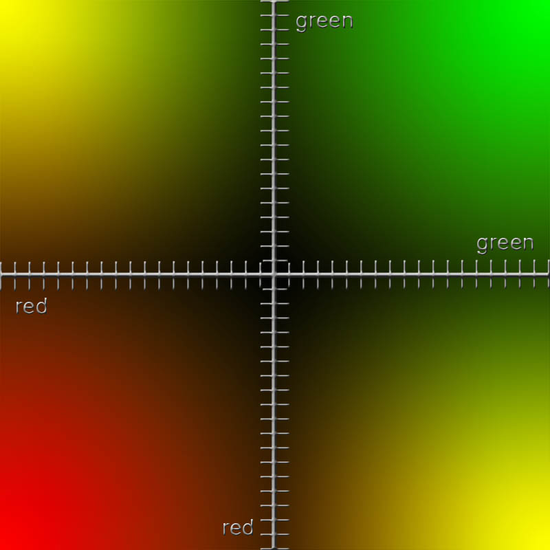To help us further visualize this concept let us create a word axis using the words red and green. In this instance, we are going to use red and green as nouns instead of adjectives. (We will use colors as adjectives later) Let us multiply a red-green axis times another red-green axis and view it visually. (See figure. 6) Multiplication of colors is similar to color addition except the disparate intensities of the colors are greater and follow a similar pattern shown in figure 5. The value of the 'numbers' is subjective and not as important as the relationship between the 'numbers'.
